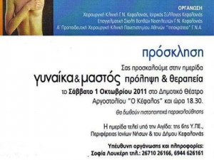 Ημερίδα με θέμα ««Γυναίκα & μαστός, πρόληψη & θεραπεία» θα πραγματοποιηθεί την 1η Οκτωβρίου και ώρα 18:30, στην αίθουσα του δημοτικού θεάτρου, «Ο ΚΕΦΑΛΟΣ», στην Κεφαλονιά. Η ημερίδα πρόληψης και θεραπείας για το καρκίνο του μαστού, αγγίζει ένα θέμα που αφορά όλους μας δεδομένου ότι τα ποσοστά της νόσου ολοένα και αυξάνονται.