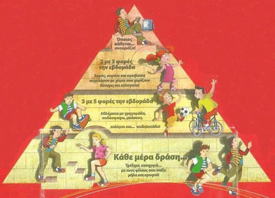 Όπως παρατηρείται, στη βάση της πυραμίδας βρίσκονται απλές φυσικές δραστηριότητες, που μπορούν να εντάξουν τα παιδιά στην καθημερινότητά τους, όπως το περπάτημα. Ακολουθούν με συχνότητα 3 φορές την εβδομάδα και άνω, αερόβιες ασκήσεις και ομαδικά αθλήματα, όπως το ποδόσφαιρο και το ποδήλατο. Στη τρίτη βαθμίδα ακολουθούν τα αθλήματα ευλυγισίας. Και στην κορυφή αυτό που πρέπει να αποφεύγεται, δηλαδή το καθισιό!