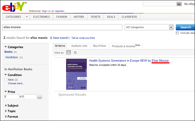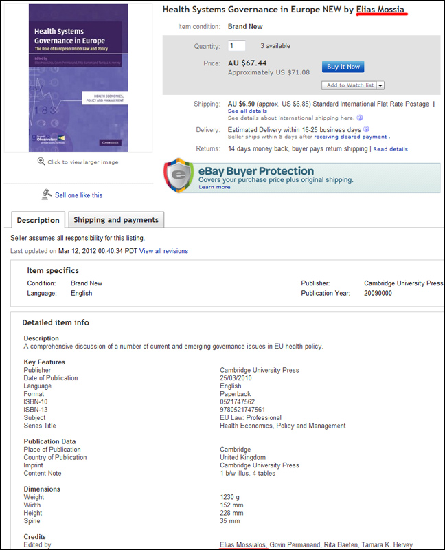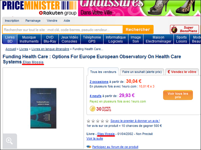 Το Elias Mossia εμφανίζεται στο γαλλικό site αγοραπωλησιών priceminister.com, με άλλο βιβλίο αυτή τη φορά (Funding Health Care: Options for Europe, εκδόσεις Open University Press):