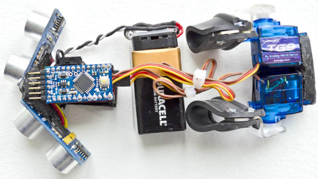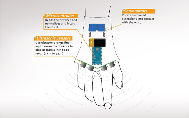 Αισθητήρες υπερήχων «μετρούν» τις αποστάσεις από 2 εκατοστά μέχρι 3,5 μέτρα, λέει ο ίδιος, ενώ μηχανοκίνητα μαξιλαράκια από καουτσούκ αυξάνουν την πίεση στον καρπό του ατόμου, όσο πλησιάζει σε κάποιο εμπόδιο.