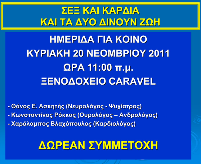 Η Ελληνική Εταιρεία Αγωγής Ψυχικής και Σεξουαλικής Υγείας σε συνεργασία με το Ινστιτούτο Ψυχικής και Σεξουαλικής Υγείας, διοργανώνει εκπαιδευτικό σεμινάριο με θέμα: «Η Ανθρώπινη Σεξουαλικότητα και οι Δυσλειτουργίες της».