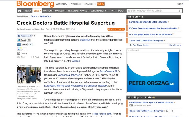 Το γεγονός ότι «οι Έλληνες γιατροί αγωνίζονται να αντιμετωπίσουν έναν αόρατο εχθρό», αναδεικνύει το δίκτυο bloomberg. Το πρακτορείο κάνει … λόγο για ένα πολύ επικίνδυνο ενδονοσοκομειακό βακτήριο, το οποίο εξαπλώνεται στα κέντρα υγείας της Ελλάδας, οδηγώντας στον θάνατο ασθενείς που πάσχουν από καρκίνο του αίματος. «Συγκεκριμένα στο Λαϊκό, το μικρόβιο σκότωσε τους μισούς ασθενείς με καρκίνο στο αίμα», αναφέρει χαρακτηριστικά.