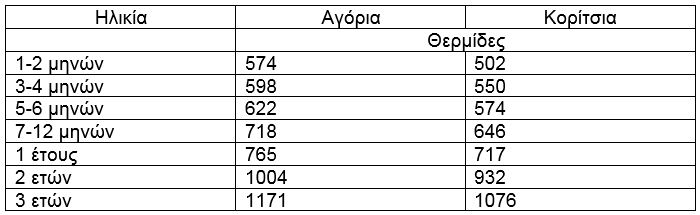 Στους παρακάτω πίνακες θα δείτε τις ενδεικτικές συστάσεις ημερήσιας πρόσληψης θερμίδων που προτείνει το Βρετανικό Ίδρυμα Διατροφής (BNF).