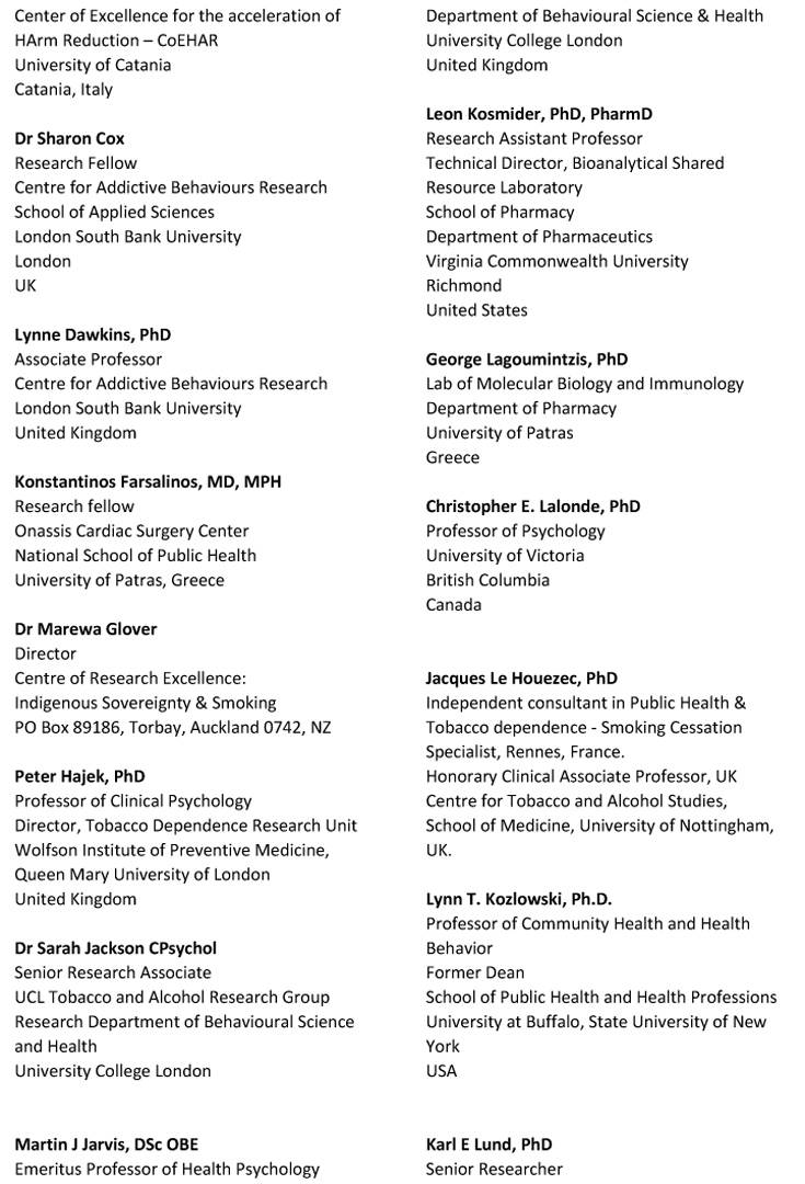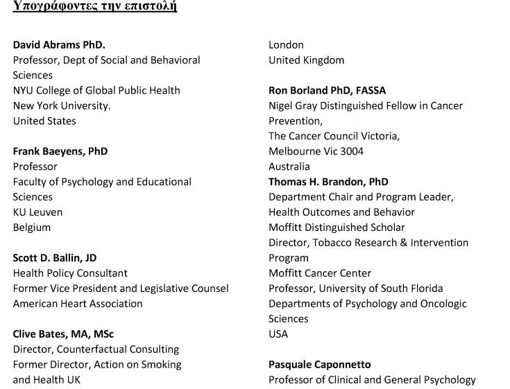 Η επιστολή κλείνει με τους επιστήμονες να ζητούν από τις Ελληνικές Αρχές να προσεγγίσουν με προσοχή τον ρόλο που μπορούν να παίξουν τα εναλλακτικά του καπνίσματος προϊόντα χωρίς καύση, όπως είναι τα ηλεκτρονικά τσιγάρα, στη μείωση του καπνίσματος στην Ελλάδα.