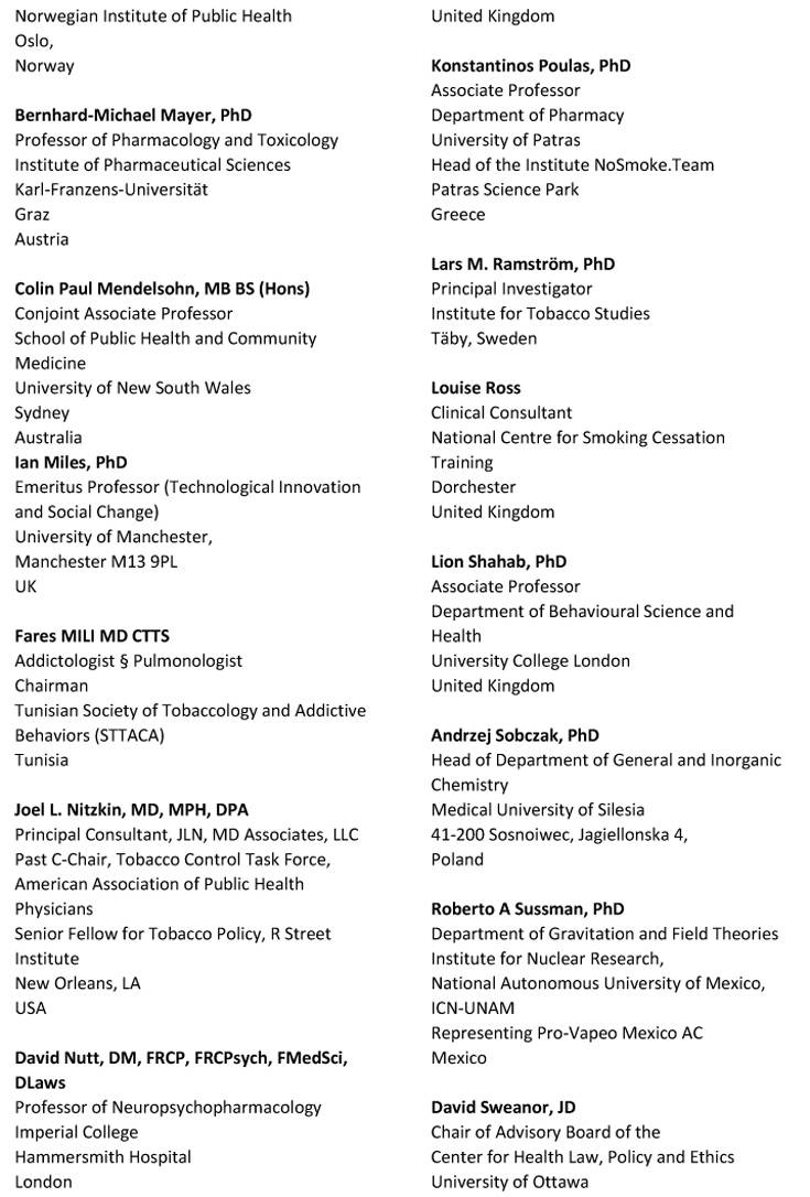 Οι επιστήμονες αναφέρουν πως «με ιδιαίτερη ανησυχία παρατηρούμε ότι η Ελλάδα θεωρεί σαν άμεση προτεραιότητα τη θέσπιση περιοριστικών, και σε πολλές περιπτώσεις μη εφαρμόσιμων, μέτρων για προϊόντα ελάττωσης της βλάβης στην υγεία από το κάπνισμα (συγκεκριμένα για τα ηλεκτρονικά τσιγάρα), παρά τα συντριπτικά στοιχεία που αποδεικνύουν ότι αυτά διαδραματίζουν σημαντικό ρόλο στη μείωση του καπνίσματος. Όπως πρόσφατα αναλύθηκε σε επιστημονικό περιοδικό, τα ηλεκτρονικά τσιγάρα δεν είναι προϊόντα καπνού και χρησιμοποιούνται από τους καπνιστές ως ένα υποκατάστατο του καπνίσματος, σε μια προσπάθεια να διακόψουν το κάπνισμα.