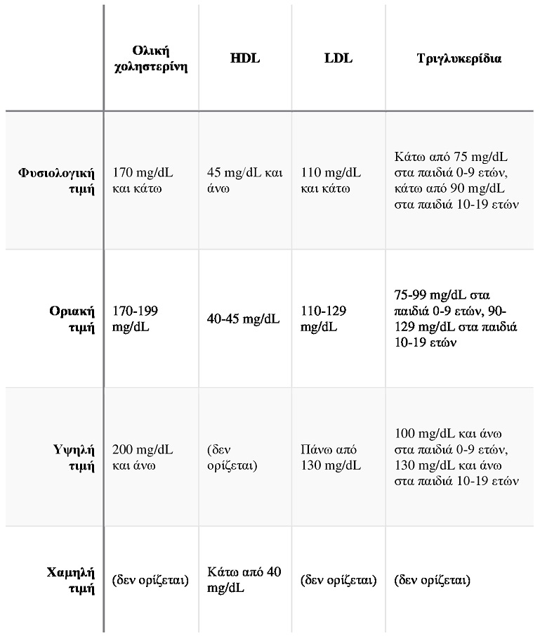Στον παρακάτω πίνακα μπορείτε να δείτε αναλυτικά ποιες είναι οι φυσιολογικές και ποιες οι επικίνδυνες τιμές χοληστερίνης στα παιδιά.