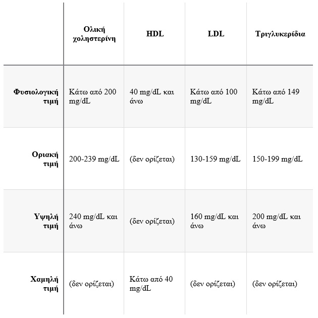 Στον παρακάτω πίνακα μπορείτε να δείτε αναλυτικά ποιες είναι οι φυσιολογικές και ποιες οι επικίνδυνες τιμές χοληστερίνης στον ενήλικο πληθυσμό.