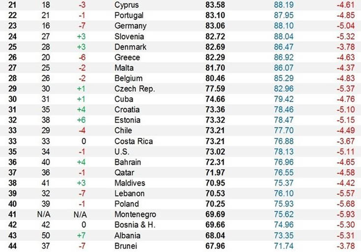Μεγάλη Βρετανία και Ιρλανδία βρίσκονται μπροστά από την Ελλάδα, στη 19η και την 20ή θέση, αντίστοιχα, η Γερμανία είναι στην 23η, ενώ η Δανία, που θεωρείται από πολλές έρευνες η καλύτερη χώρα να ζει κανείς, βρίσκεται στην 25η θέση, ακριβώς μπροστά από τη χώρα μας.