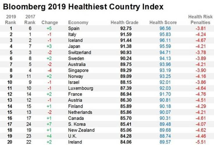 Tη λίστα με τις τους πιο υγιείς λαούς στον πλανήτη δημοσιοποίησε το Bloomberg σύμφωνα με το Global Health Index που παρουσίασε. Η Ελλάδα βρίσκεται μεν ψηλά σε αυτήν την κατάταξη, ωστόσο υποχώρησε κατά έξι θέσεις, στην 26η από την 20ή.